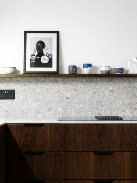 The design creates a series of new spaces that fulfil these criteria by inserting new partitions, a mezzanine floor, and a full height sliding partition. The mezzanine floor creates a desk platform over a new storage space that allows a separate designated workspace that still connects socially with the kitchen beyond.